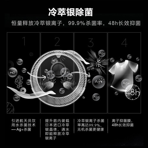 日本进口冷萃银,磁力般吸附在衣服纤维表面,形成离子膜,长效祛菌。采用八横四纵结构设计,双筒恒温运行,同洗同脱安静平稳。