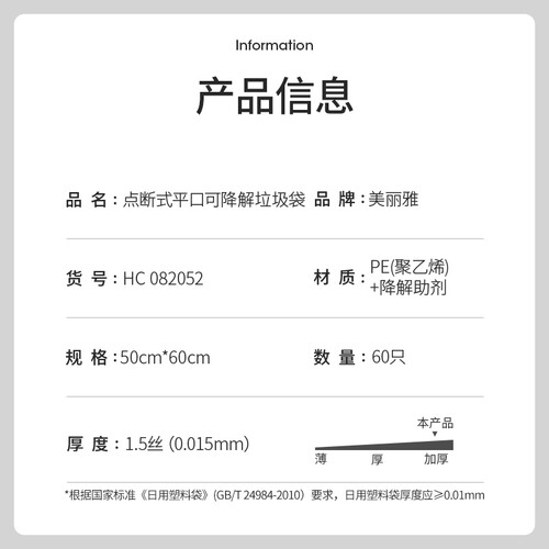具有1.5丝厚度设计,强韧牢固,轻易不会破损。添加降解助力剂,可以自然进行降低,更好的保护环境。