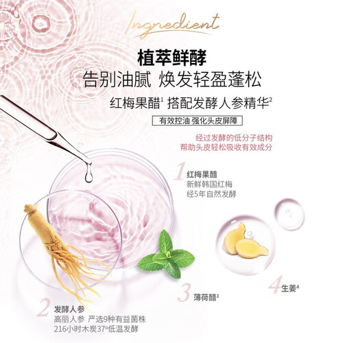 添加红梅果醋和发酵人参精华,调节头皮油脂平衡,补充发丝营养,维持清爽的头皮状态,强韧头皮屏障,打造蓬松秀发。