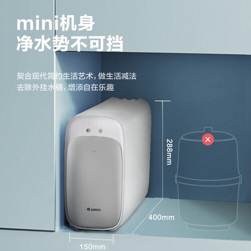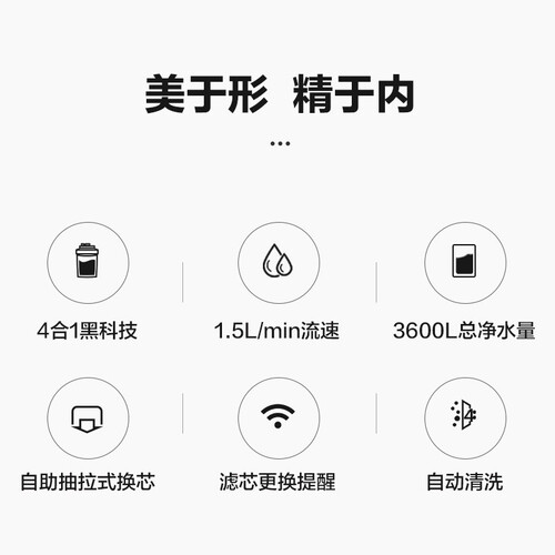 四重精滤净水,采用4和1滤芯过滤更加有效,用水更加安全卫生。mini机身,摆放不占空间,可以安心摆放在厨房。
