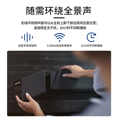 配备无线有源低音炮,影视打斗场面更震感,随时代入剧情中。支持Play-Fi音响组件不同房间WIFI连接,满足共享需求。