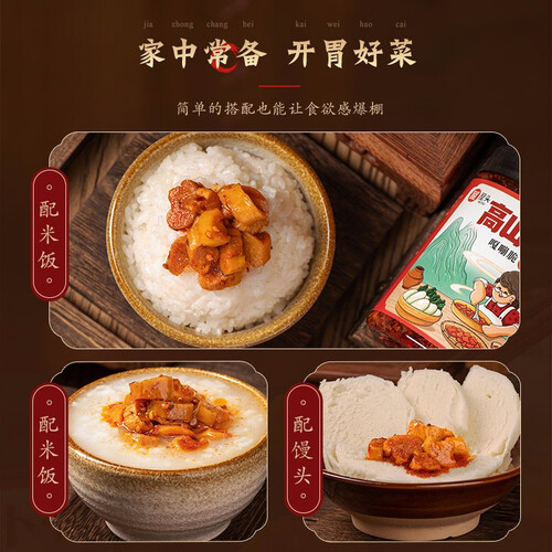 精心挑选云贵川萝卜干,厚实饱满香气浓郁,口感鲜美醇厚。上好的酱料,开盖后就可以闻到浓郁的香气,令人胃口大增。