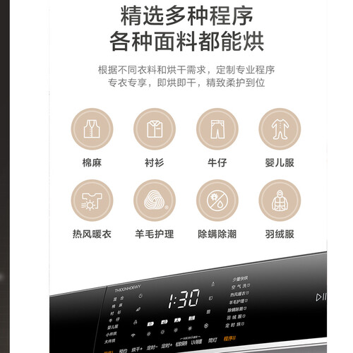 采用触控面板设计,反应灵敏响应快速,打造快捷调控体验。远程智能控制,提前开启烘衣模式,到家即可取出衣物。