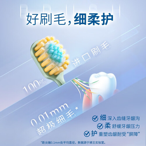 牙刷头加宽的设计,刷面更大,清洁能力更强,刷头薄,可以轻松刷到智齿。