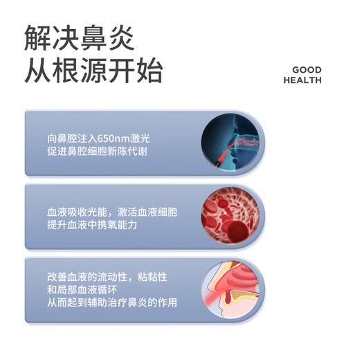 激光疗法,不会造成皮肤创伤。激光头可重复使用,鼻套更换简单,清洁方便。机身小巧轻盈,续航持久,易于携带。
