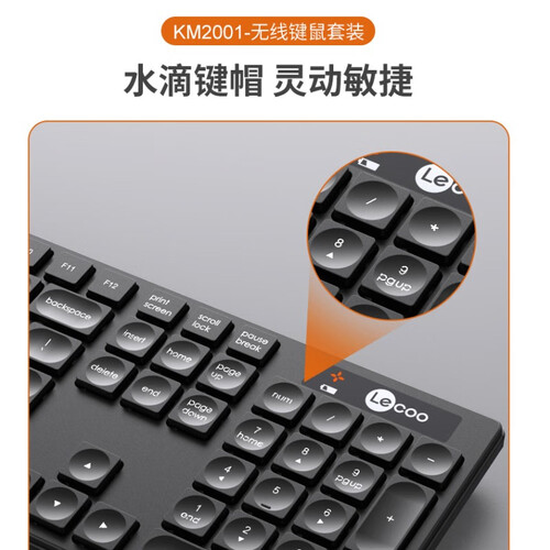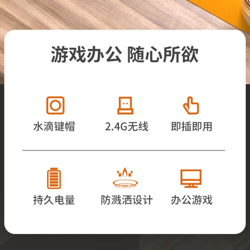 扁平设计,轻薄机身,一个接收器,键鼠共用,自由移动不受限制,智能休眠,持久电量,采用水滴键帽,灵动敏捷。