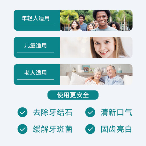 有效去除牙结石、食物污渍以及难去除的烟渍、茶渍等。有效预防牙龈炎、牙龈萎缩、牙龈出血以及口腔溃疡等多种口腔问题。