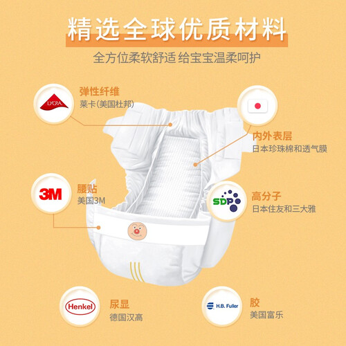 3D立体热风无纺布面层,质感柔软亲肤,给小屁屁亲和呵护。芯体内采用了SAP高分子,可以长时间保持干爽不易渗漏。