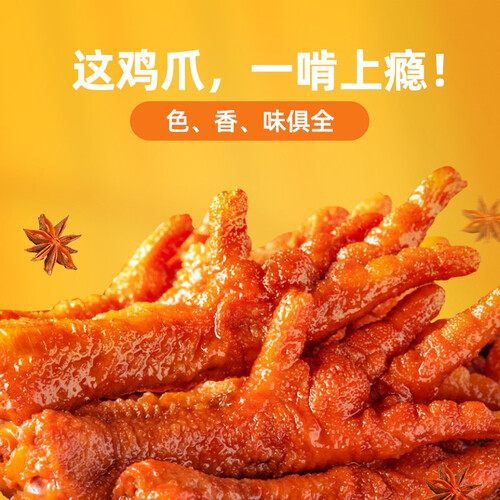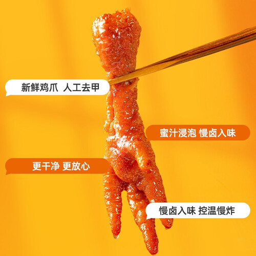 选用白羽鲜鸡爪材质,个大肉多,具有香辣爽口特点,入口好滋味。经过人工剪甲,更加干净卫生,让您可以放心食用。