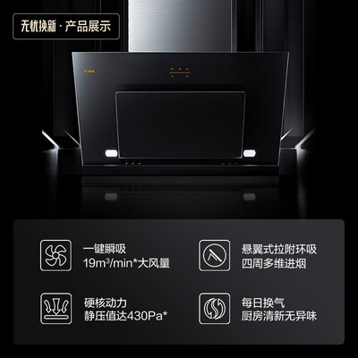 外观造型设计时尚精致,纯净机身点缀家居空间,高颜值生活品质,提升艺术美学质感。悬翼式拉附环吸设计,多方位立体吸收油烟。