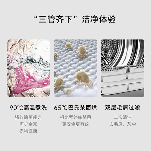 具有90度的高温煮洗功能,婴儿衣物也能放进去清洗,妈妈更放心。搭载智能投放系统,智慧投放洗衣剂,防止过量投放。