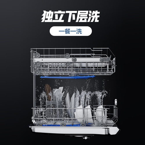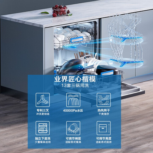 三叉喷淋设计,每转一圈就能多洗一遍,碗盘边角顽固污渍也能清洗干净。40000Pa变频电机,自动匹配洗涤程序,清洁更省心。
