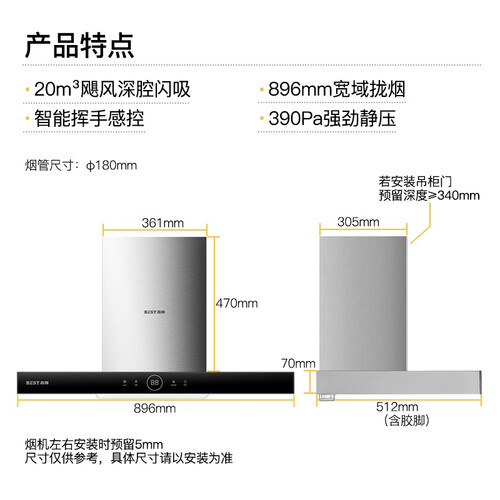 烟机支持三分钟延时关机,炒菜结束后自动运行三分钟,可以排净厨房残留余烟。燃气灶支持猛火爆炒,爆炒食材更美味。