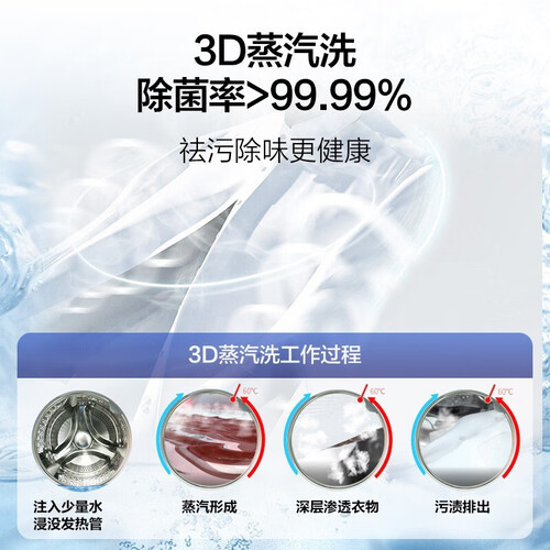 采用3D除菌洗,蒸汽预洗,有效去除顽固污渍,除菌率可达99.99%。单烘干及1小时洗烘两种模式,强效便捷。
