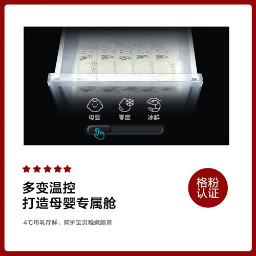 三挡可调变温区的设计,守护母婴健康,可存储母乳,保留原有新鲜和营养。离子净味保鲜,冰箱内环境无异味。