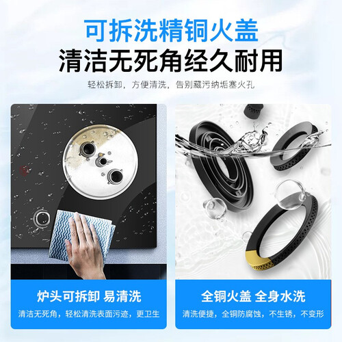 拥有三圈火焰,有效扩大燃烧面积,食材可以均匀受热。甄选精铜火盖,可以轻松拆卸清洁,表面污迹快速去除,保障洁净质地。