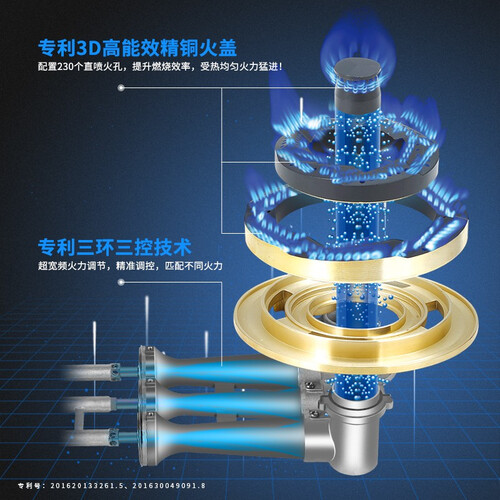 3腔体进气,使得燃烧更充分,猛火加热,烹饪更快速。全铜火盖可拆卸设计,有利于深层清洁,油污不残留,干净卫生。