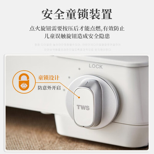 乳白色的外观,侧面有三个散热网孔,减轻热度。旋钮处要按压后旋转才能开启,有效防止儿童吴转。