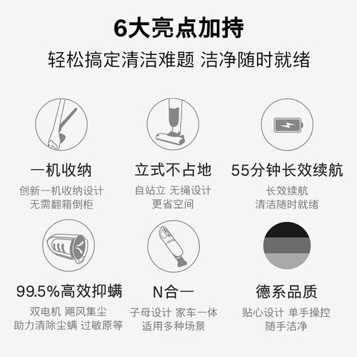 升级自站立设计,没有任何充电线的束缚,轻松就可以收纳在家居任意角落,节省时间。先进锂电池技术加持,55分钟长久续航。