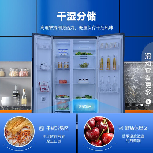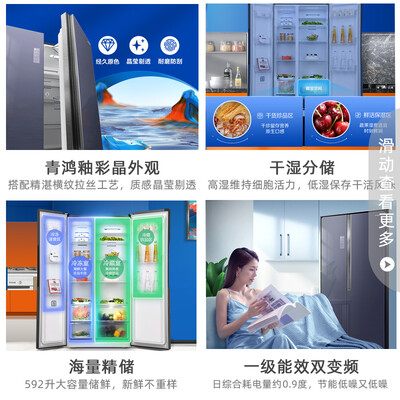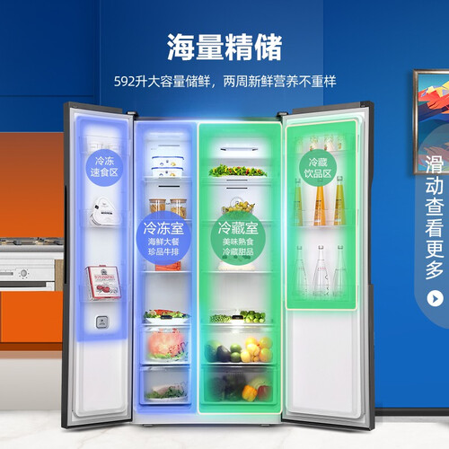 采用精细化的科学储鲜空间设计,满足不同的食材保鲜需求。搭载双变频系统,强劲动力能保持冰箱平稳运行。
