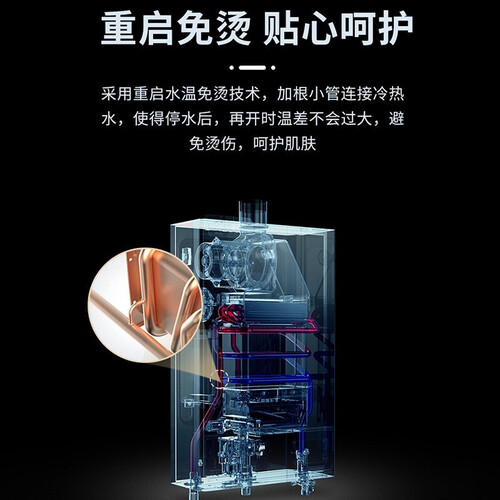 采用重启水温免烫技术,使用停水后再次开启温差不会太大,呵护肌肤。直流变频循环泵,可以实现低温启动,高楼层也无忧。
