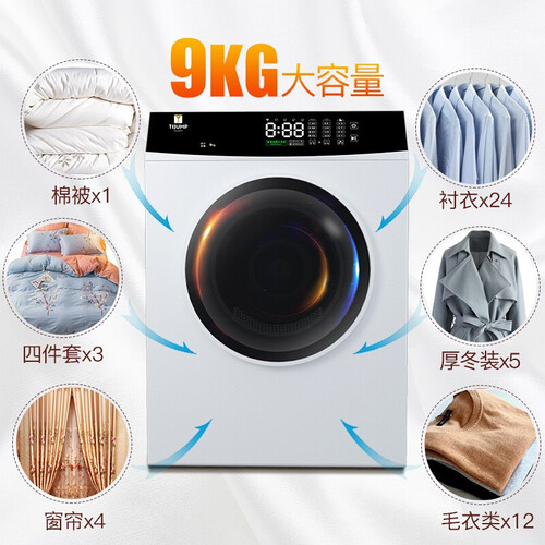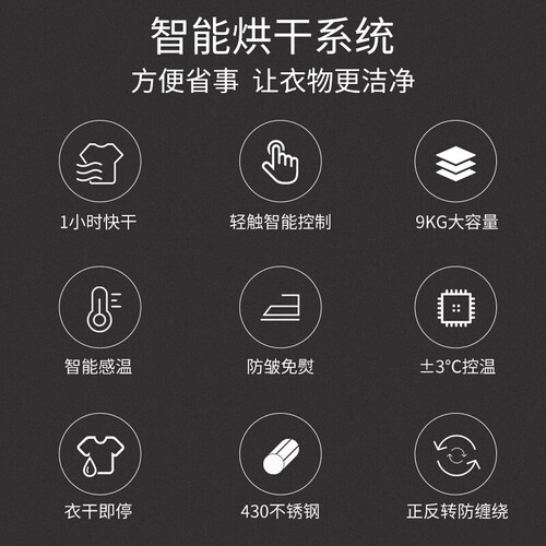 清晰led触摸屏,全程灵活感知,操作更加便捷。正反转抖散处理,可以防止衣物缠绕,烘干后衣物保持平整有型。
