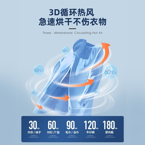 设计定时干衣系统,到点自动停止,能够避免过度干衣。结合蒸汽塑形设计,可以帮助衣物塑形,减少衣物褶皱。