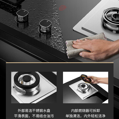 使用防爆钢化玻璃面板,光滑鲜亮,污渍清理方便。灶头采用加大口径喷嘴,可提供更大火力,轻松制作多种美食。
