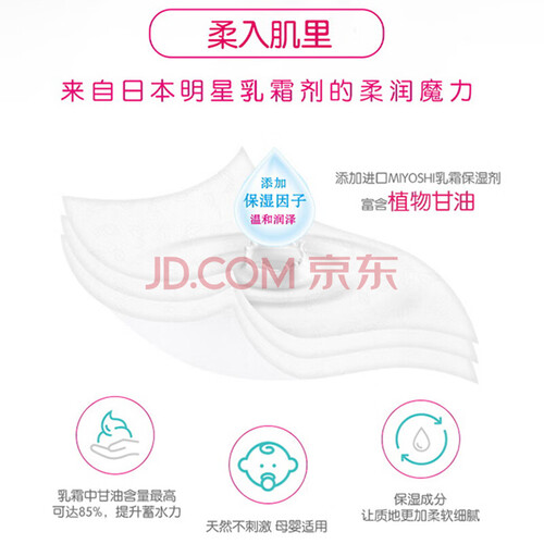 严选天然温和的原生木浆制作,经过改良工艺制作,触感更加柔软舒适。同时添加了植物甘油,柔润保湿,适合宝宝使用。