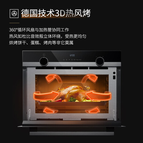 36升的大容量设计,轻松容纳丰富美味。使用德国技术的3D热风烤,使食物能够环绕均匀的受热,烤出来的食物味道更鲜美。