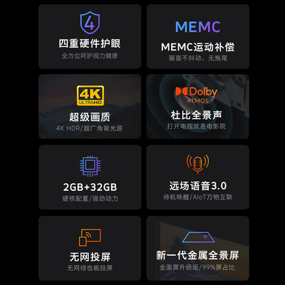 支持杜比全景声,重现震撼的氛围,仿佛置身演唱会现场。搭配三重硬件护眼技术,满足全天候观影需求,呵护你的眼睛。