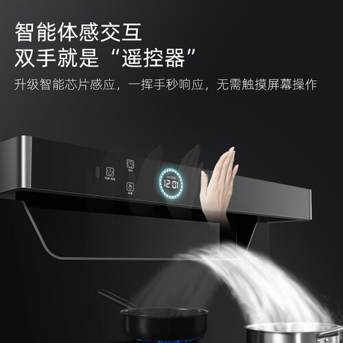 烟灶采用下排式侧吸设计,排烟迅速吸力大,快速拢烟不外溢,令厨房空间更清新。6.86英寸显示大屏,方便快速查找菜单。