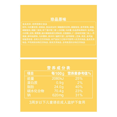 精选内蒙及山东优质荷兰系列土豆,沙糯甘甜,带着阳光与新鲜。薯片与饼干之间的第三种美味,非油炸的烘焙工艺,满足味蕾的欲望。
