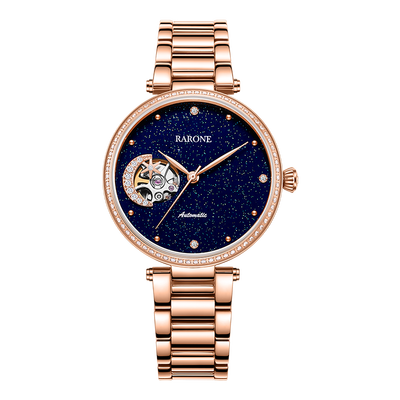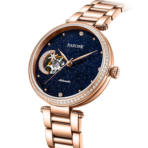 将新西兰所见璀璨星空作为设计灵感,湛蓝表盘星光耀眼,星月辉映倍显神秘与优雅。镂空机芯窥见时光律动之美,感受时光的流逝。