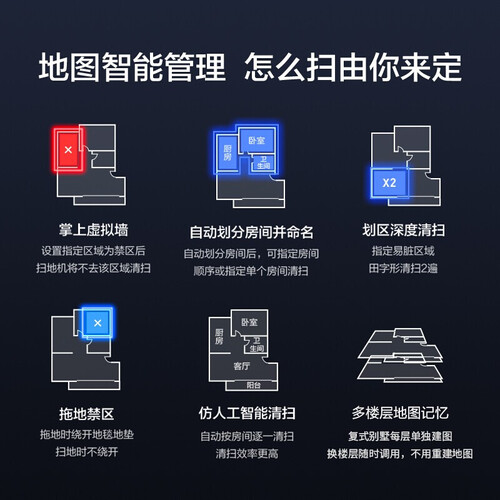 搭载激光雷达技术,能够快速建立环境地图,并智能规划清扫路线,还搭载七重降噪技术,有效降低扫地机器人工作噪音。