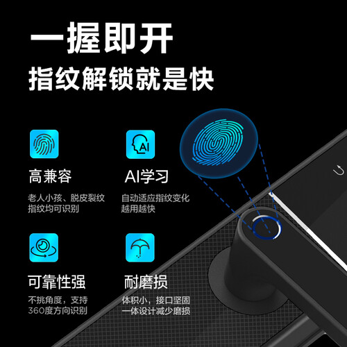 内置半导体指纹识别系统,可以快速准确的分析指纹,既安全又方便。支持手机APP操控,临时密码设置,客人到访无需等待。
