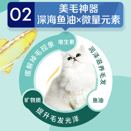 精选优质原材料,蛋白质丰富且脂肪少,能够在补充营养的同时保持身体健康。特别添加深海鱼油成分,使爱宠毛发更加浓密,利于增亮毛色。