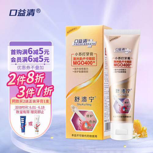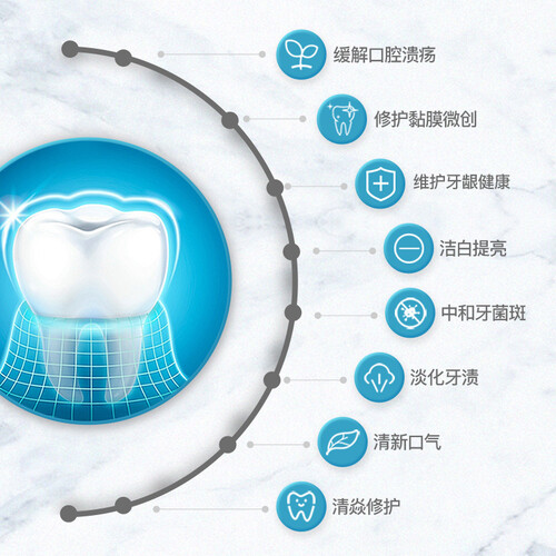 含有小苏打、蜂胶提取物,温和清洁牙齿,淡化牙渍,焕发健康亮白光彩。修护黏膜损伤,舒缓口腔不适,呵护牙龈健康。