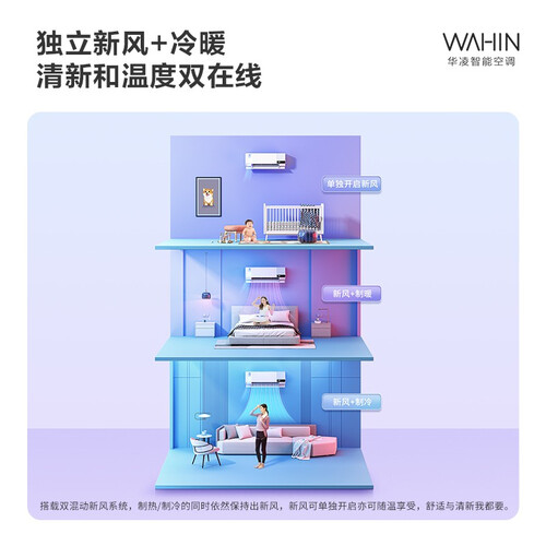 外观可选,打造独有空调。60㎡/h大新风量,新风多,不怕闷。没有要遥控器,智能操作更有趣。LCD动态显示屏,直观清晰。