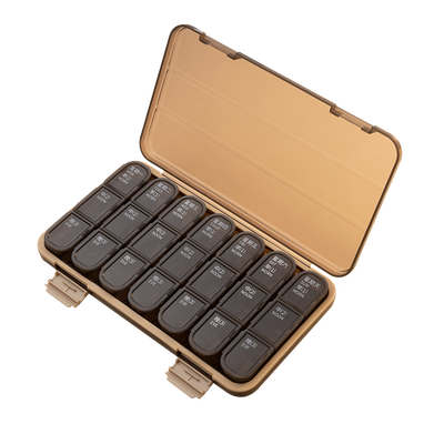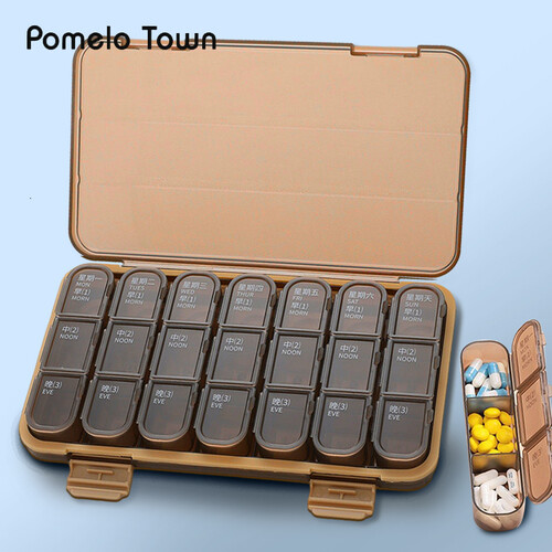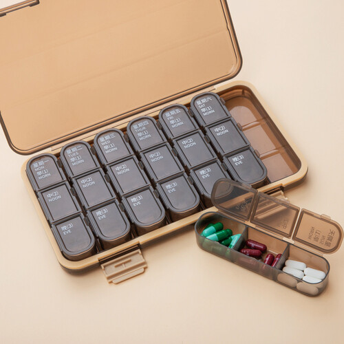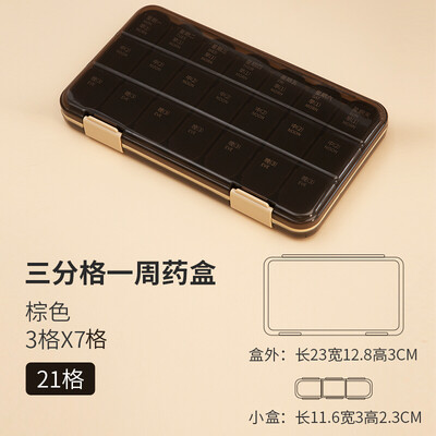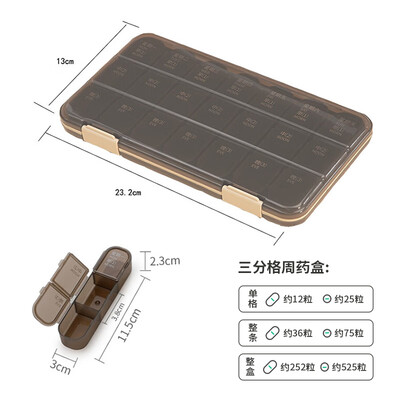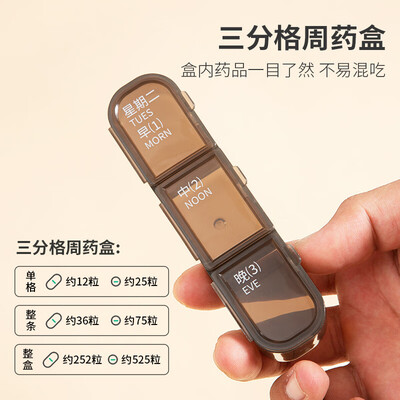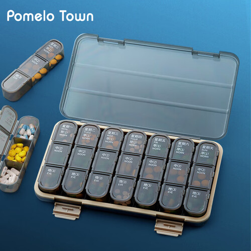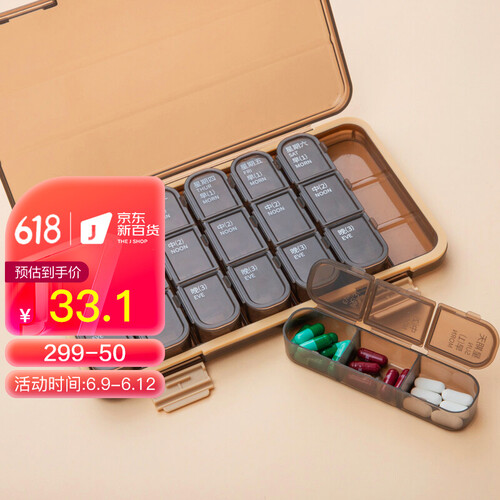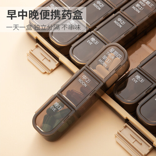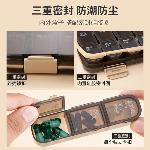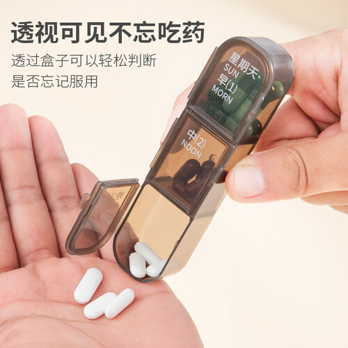采用七天便携设计,分格密封药盒,防潮防尘,开口位置做吐出设计,单手向上轻推也可以开盖。透过盒子可以看到药物情况,轻松判断吃没吃药。