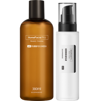 能够净化肌肤的水乳套装,乳糖酸水可帮助收敛粗大毛孔,清除黑头与闭口。低聚糖乳液内含锁水成分,可带来为肌肤带来长久保湿。