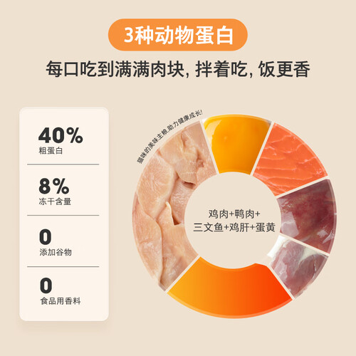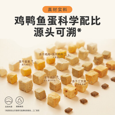 高达83%动物性原料,每口吃到满满肉块,轻松迎合猫咪挑剔的味蕾。5种肉食冻干,为猫咪补充多种优质动物蛋白,对壮骨增肌特别有益。