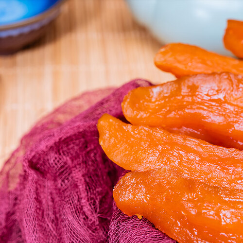 红薯干肉质津润厚实,柔软绵糯,细嚼弹牙筋道。严选传统手艺晾晒,保存营养成分不丢失,脆嫩多糖,味道香甜。