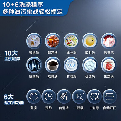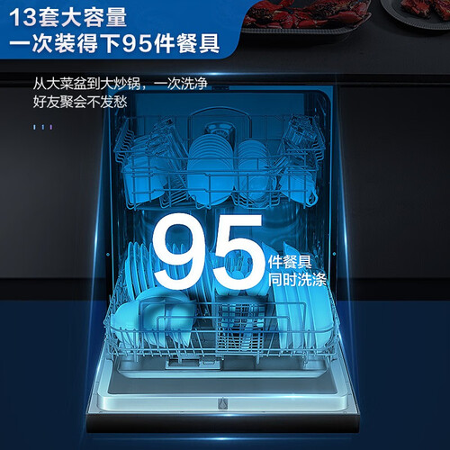 优雅机身搭配晶彩触控面板,实拍彩色图标指示,功能模式清晰直观,触控更省心便利。13套大容量洗碗,锅碗瓢盆一次搞定。