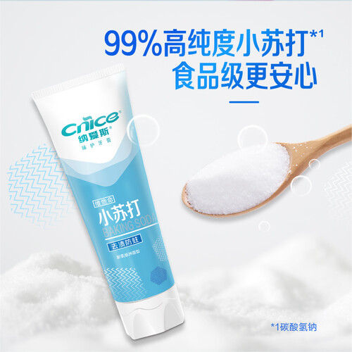 特别添加99%高纯度小苏打,食品级成分可安心入口,搭配HCPs净白颗粒,协同去除牙齿表面牙渍,get亮白牙齿。