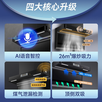 搭载智能语音声控功能,烟机可随时等待你的召唤,开关机特方便。52分贝降噪柔声科技,净烟不吵闹,推荐更多家庭使用。
