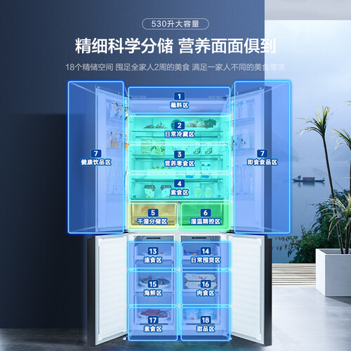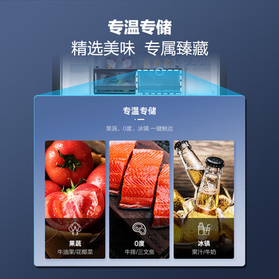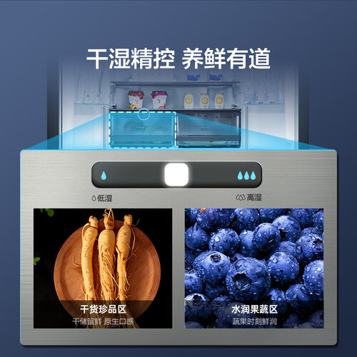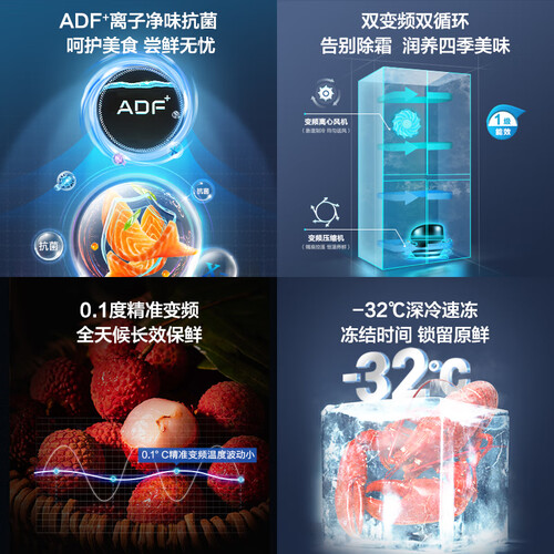 ADF+离子净味保鲜技术,快速去除异味,抗菌率达99%。拥有可调湿抽屉,满足不同食材储存的湿度需求,使食材鲜润如初。
