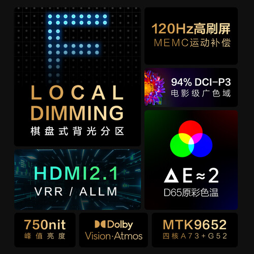 采用棋盘式分区背光技术,通过分区独立控制光源,呈现出深邃立体的暗夜之美。内置双杜比认证,带来影院级的视听盛宴。