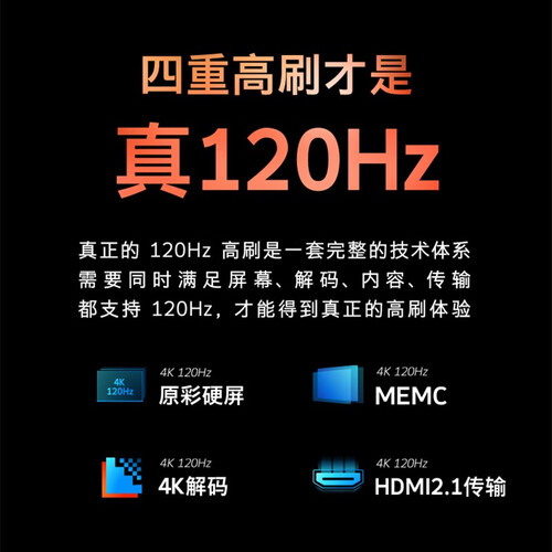 真120Hz四重高刷,内容精彩呈现,体验更畅快。4K 120Hz原彩硬屏的设计,显示更多色彩,享受沉浸式观影。