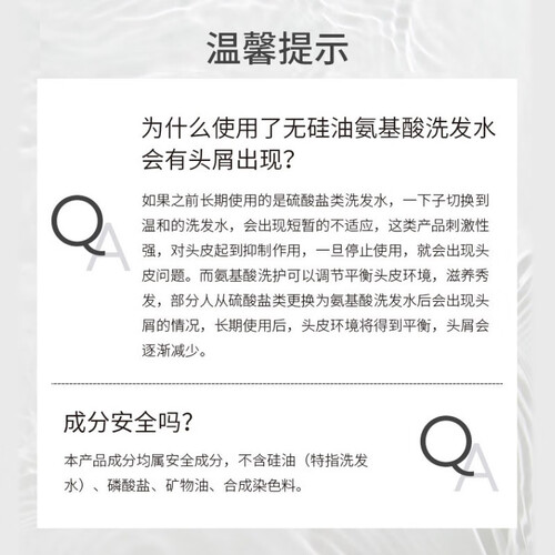 氨基酸表活,温和清洁秀发,净澈但不刺激。帮助修复受损毛鳞,顺滑细腻柔顺,秀发健康更显光泽。改善水油,避免发丝油腻结块。